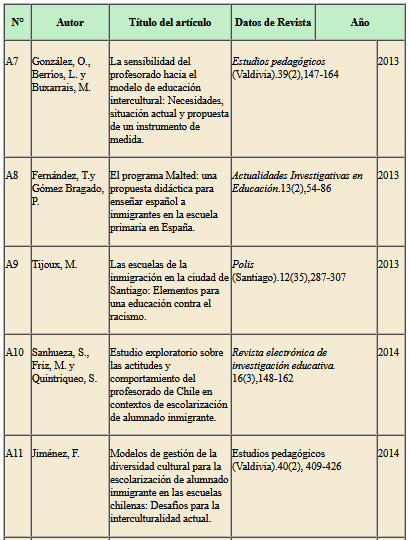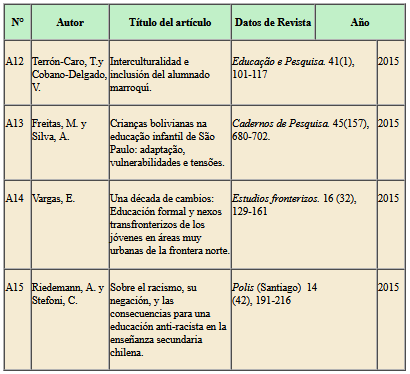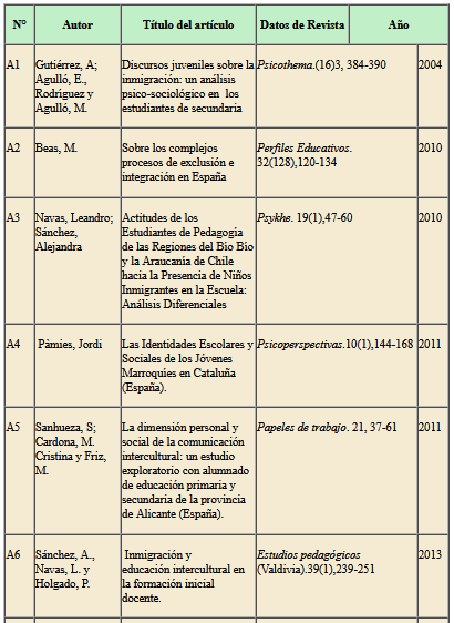 El análisis del corpus de artículos señala que la temática de educación e inmigración ha sido estudiada entre los años 2004 y 2016, a través de un 40% de los artículos que analizan la inmigración en el contexto escolar desde el foco de la exclusión/ inclusión, siendo de interés en lo específico las acciones racistas y la lengua como barreras para la inclusión de los inmigrantes en la escuela. Desde una mirada diacrónica, también es posible visualizar la frecuencia de artículos y los focos de interés desde los cuales se ha abordado como objeto de estudio la temática referida a Educación e Inmigración y los países donde se han desarrollado las investigaciones: 46,6% en España, un 40% en Chile y un 13,2% en México y Brasil. El abordaje de la temática de interés ha transitado desde la experiencia juvenil de la inmigración, donde se habla de una vivencia de racismo sutil, para llegar en el transcurso de una década a abordar de manera directa el racismo como una experiencia que viven los escolares inmigrantes y que es negado y a la vez legitimado por parte de los docentes (A 15).