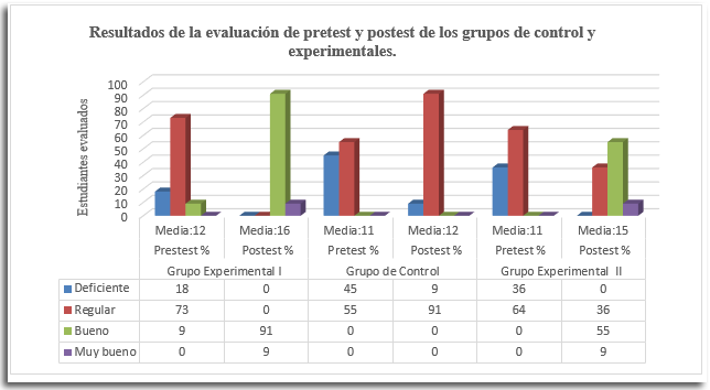 Al finalizar el 2018, luego de un año de trabajo se administró un cuestionario (postest), a los grupos experimentales y de control, de cuyo análisis comparativo de las calificaciones del conocimiento conceptual de educación ambiental entre el grupo control y experimentales se observa diferencias significativas en las medias y niveles de logro, después de la aplicación del tratamiento, siendo superiores los grupos experimentales. En cambio, en el grupo control la diferencia es mínima entre el pretest y postest. (gráfica 1).