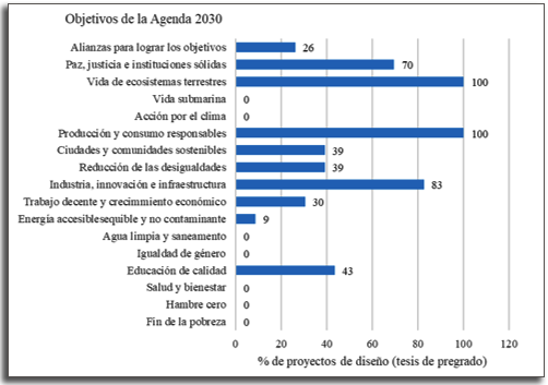 Con el trabajo metodológico y las acciones de superación del cuerpo docente se orientó la incorporación del ciclo de vida al proceso de enseñanza-aprendizaje desde los primeros años de formación del diseñador y que deberá perfeccionarse en lo adelante. Lo que a su vez, permitió en las tesis de pregrado del curso de Diseño del ISPH, la incorporación de la etapa Vida útil y Fin de vida al conjunto de condicionantes del diseño Producción, Distribución (Circulación) y Consumo. El cuerpo docente se ocupó de las tutorias de las tesis de pregrado y la formación ambiental figuró como precedencia en los estudiantes que enfrentaron el trabajo de culminación de curso. Estas acciones estratégicas proporcionan un carácter preventivo y de mejora continua al proceso de diseño. Se definió la línea de investigación Gestión del Diseño Sostenible, sustentada en la Agenda 2030. Esto establece las bases teóricas-prácticas necesarias según el factor Contexto, Función, Uso, Mercado y Tecnología para la integración de la dimensión ambiental en la actividad docente y la materialización de los resultados en las actividades de extensión de la universidad. Las interrelaciones de las actividades sustantivas del ISPH permitió la selección de los 23 temas de culminación del curso de Diseño del 2019, que por su carácter proyectual, implementaron un proceso de diseño en cinco etapas: Necesidad, Problema, Concepto y Desarrollo (Fig.2). El 100 % de los proyectos tuvieron en cuenta los objetivos de la Agenda 2030 y coincidieron en igual cantidad en el objetivo 12 “Producción y consumo responsable” y el objetivo 15 “Ecosistemas terrestres”, seguido del objetivo 9 “Industria, inovación e infraestructura” y el objetivo 16 “Paz, justicia e instituciones sólidas”, como muestra la Fig. 3.