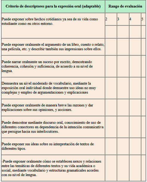 El MRCER (2002: 222-223) tiene establecidos los descriptores para la evaluación de la expresión oral y escrita. Teniendo en cuenta de que el Marco, responde a necesidades y condiciones en otros contextos, por tanto, algunas de sus propuestas no se adecuan a las circunstancias en las que se desarrolla el trabajo docente descrito en este artículo. Por tanto, estos descriptores, se han adaptado en dependencia de las necesidades y condiciones en las que se desarrollen las clases de español para los estudiantes no hispanohablantes actualmente, los cuales están en proceso de aprendizaje de la lengua española (Nivel B1); y al mismo tiempo se encuentran estudiando una especialidad estos elementos se deben tener en cuenta y tratar de ser muy objetivos al medirlos en los estudiantes.