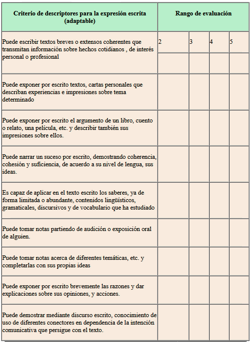 Así que, para medir el nivel en la expresión escrita y oral de los estudiantes no hispanohablantes, parten de los criterios de evaluación que el profesor, la experiencia, las orientaciones del Programa de la asignatura, las necesidades y las exigencias en cuanto al nivel de lengua, entiende que deben poseer los estudiantes, (por ello se denominan “adaptables”); esto permite ubicarlos en escalas que posibilitan llegar a una conclusión evaluativa: 2 corresponde a al alumno insuficiente; 3 poco suficiente; 4 suficiente; y 5 muy suficiente.