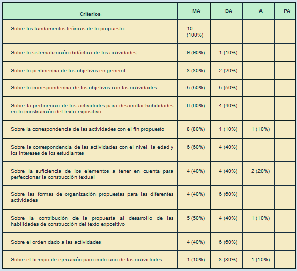 Validación de la propuesta por los especialistas: Se colocaron 10 encuestas para la validación de la propuesta del sistema de actividades. Estas fueron aplicadas a 10 especialistas de 3 universidades: La Universidad Nacional de Panamá (4), Universidad Tecnológica de Panamá (2), Universidad de Ciencias Pedagógicas Enrique José Varona de la Habana (4). Tres de ellos están formados en el nivel de doctorado y 7, de magíster. Los docentes tienen desde 18 a 42 años de servicios y son profesores auxiliares, titulares y especiales. El nivel de competencia (de 1 a 10) que los profesores señalaron en cuanto al tema en cuestión es: 3 (30%) indicaron 8, 3 (30%), 9 y 4 (40%), 10. En cuanto a la fuente de argumentación y el conocimiento teórico acerca del tema en una escala de alto medio y bajo: 6 (60%) indicaron alto y 4 (40%), medio. En relación con la fuente de argumentación, nivel empírico 4 (40%) señalaron alto y 6 (60%), medio. Se les presentó 12 criterios para evaluar la propuesta, estos son: MA (Muy adecuado) BA (Bastante adecuado) A (Adecuado) PA (Poco adecuado) NA (No adecuado). Los resultados fueron los siguientes: