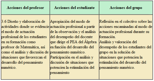 Objetivo: Realizar las acciones planificadas para el desarrollo del PN en la formación de pregrado del profesor de Matemática desde el PEA del Álgebra, en correspondencia con los resultados del diagnóstico.