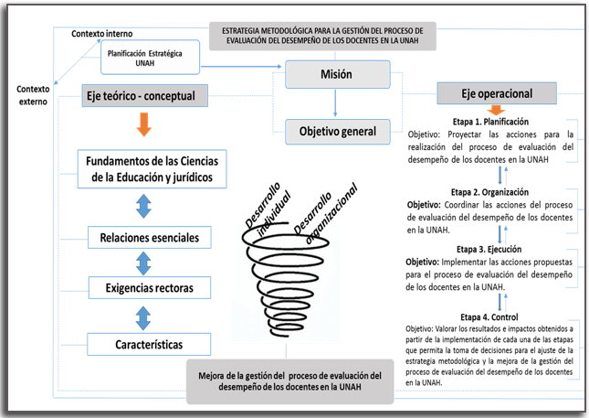 La estrategia metodológica para la gestión del proceso de evaluación del desempeño de los docentes en la UNAH está compuesta por la Misión, el Objetivo general, un Eje teórico - conceptual y un Eje operacional. El primero de estos ejes está formado por los fundamentos que emanan de las Ciencias de la Educación (filosóficos, sociológicos, psicológicos, económicos, pedagógicos) y por referentes de naturaleza jurídica, las relaciones esenciales, las exigencias rectoras y las características del resultado científico. El segundo tiene entre sus componentes: las etapas (planificación, organización, ejecución y control) con sus correspondientes objetivos y acciones. Los componentes de la estrategia metodológica propuesta están interrelacionados de manera dialéctica y armónica en función de mejorar la gestión del proceso en estudio para que contribuya al desarrollo individual y organizacional y a la satisfacción de las demandas del entorno.