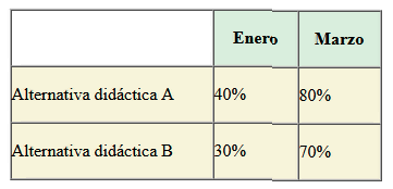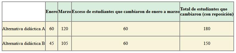 Supongamos que en enero el referido profesor ha aplicado tanto la alternativa A como la B a 150 estudiantes suyos; asimismo, procedió en el mes de marzo. En la siguiente tabla aparece el cálculo de la cantidad de estudiantes que han tenido éxito con cada alternativa didáctica, evidentemente en correspondencia con los porcentajes que se muestran en la Tabla 1.