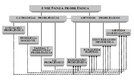 Enseñanza problémica (Figura 2). Para muchos autores, constituye un tipo de enseñanza basada en contradicciones dialécticas, que vinculan a los alumnos con la investigación. Constituye una vía importante para potenciar la actividad cognoscitiva productiva, ya que propicia el enfrentamiento de los alumnos a contradicciones que deben solucionar con su activa participación y de forma independiente, a fin de lograr un aprendizaje productivo; se relaciona con el proceso de búsqueda, de solución de problemas y de actividad creadora (Hernández, J.L., 1997: 7). El conocimiento de este tipo de enseñanza (sistema didáctico, para otros autores), así como su utilización en las clases, es aún muy pobre; la mayoría de los profesores carecen de un dominio adecuado de sus fundamentos teóricos y no la aplican consecuentemente, aun cuando creen hacerlo, confundiéndola con gran frecuencia con la llamada “enseñanza basada en problemas”; o sea, que en ocasiones se da incorrectamente el calificativo “problémico(a)”.