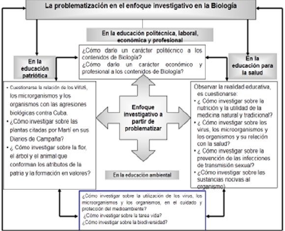Enfoque investigativo (Figura 3). Uno de los problemas más complejos que, en la actualidad, enfrentan las escuelas es lograr, en los alumnos, una actividad investigativa cotidiana, que les permita una actividad reflexiva, crítica y transformadora de la realidad de la comunidad. Hay que enseñar a los alumnos a solucionar problemas educativos mediante la investigación en las escuelas secundarias básicas y los institutos preuniversitarios. Se hace necesario que se desarrollen estrategias que favorezcan la búsqueda del contenido y que, al mismo tiempo, constituyan un modelo de actuación profesional pedagógica para su trabajo en la escuela. De esta manera, los alumnos consideran el proceso de enseñanza-aprendizaje en su acción transformadora de la realidad, vinculando permanentemente teoría y práctica por medio de la investigación (Delgado, M.I., 2004).