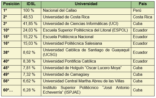 Existen seis Universidades latinoamericanas con un amplio uso del software libre entre las 20 primeras del mundo, donde tres de ellas son ecuatorianas. Así mismo entre las primeras 60 universidades del mundo se encuentran cinco de Cuba y cinco de Ecuador con importantes resultados obtenidos.