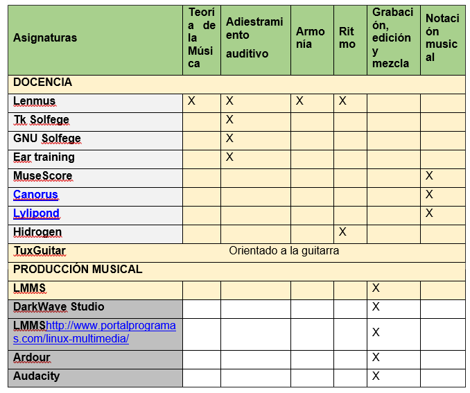En la Tabla 2 se muestran el software libre más utilizado en el campo de la docencia y en el área de la producción musical. Se hace esta división por razones organizativas ya que la producción musical puede estar presente en el universo pedagógico, pero partiendo de las necesidades docentes de las diferentes asignaturas de la carrera de Música de la Facultad de Artes y Humanidades de la Universidad Católica de Santiago de Guayaquil (UCSG), se agrupan en docencia y producción musical.