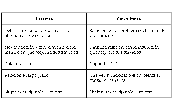 Dentro de la teoría de la Administración Empresarial los términos consultoría y asesoría son empleados indistintamente para hacer referencia a relaciones profesionales basadas en la solicitud de servicios de ayuda. Algunos autores definen la asesoría como una forma de realizar la consultoría, la vía mediante la cual el consultor da respuesta a la consulta “(…) es cualquier forma de proporcionar ayuda sobre el contenido, proceso o estructura de una tarea o serie de tareas donde el asesor no es realmente responsable de hacer la tarea él mismo, pero está ayudando a aquellos que lo son.” (J.H y S, 1992: 42). Estas ideas son compartidas por Schein, (Schein, 1990: 237) y Codina, (Codina, 2014: 394).