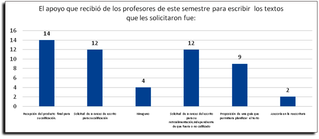 Continuando con las apreciaciones enfrentadas es muy diciente que si la intención es enseñar a escribir los textos que los estudiantes emplearan como profesionales, los profesores deberían acompañar este proceso para poder guiar la elaboración del plan de escritura y hacer seguimiento a su desarrollo; en el gráfico 3 se revela que el apoyo que los estudiantes recibieron por parte de sus profesores para la escritura de los textos del curso fue recibir el producto final para su calificación. Situación que refleja la necesidad de orientar a los profesores del programa para el acompañamiento de los procesos lectores y escritores, y da pertinencia al objetivo de este estudio que es el desarrollo de una estrategia metodológica para la alfabetización académica en el programa de Licenciatura en Pedagogía Infantil, de la UNIAJC.