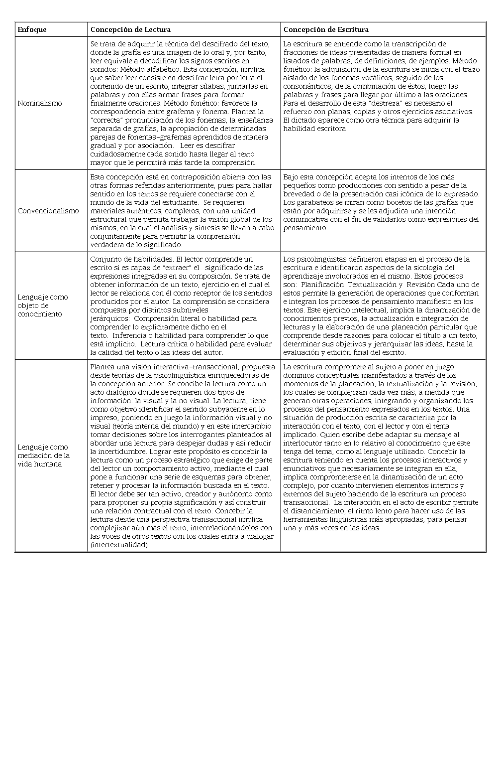 Las concepciones sobre la lectura y la escritura han transitado por diferentes enfoques que a continuación se resumen en el cuadro 1.: