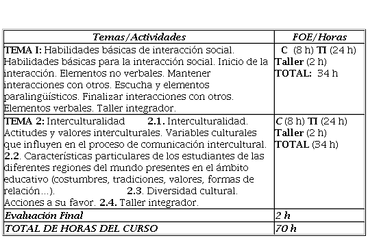 El curso contó con 22 horas presenciales y 48 no presenciales, dirigido por la autora de este trabajo, con el fin de preparar a los docentes en conocimientos, habilidades y actitudes para comprender la diversidad de formas de pensamiento y modos de actuación que se manifiestan en su entorno, desplegar la labor educativa a favor de las relaciones interpersonales positivas, la integración y la convivencia armónica, y lograr interacciones satisfactorias de acuerdo a la características particulares del estudiantado. Las horas presenciales se dedicaron a conferencias especializadas y talleres, y las no presenciales son para la autosuperación y los trabajos propuestos en el curso. Se desarrollaron 9 talleres de 2 horas presenciales durante 2 meses y medio y las temáticas descritas en el programa se correspondieron con los problemas diagnosticados. (Anexo 1)