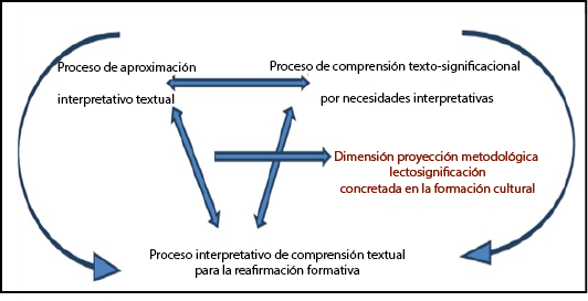 Una vez realizados los análisis y argumentaciones anteriormente expuestas, en esta lógica de modelación emerge la Dimensión proyección metodológica lectosignificacional concretada en la formación cultural para la producción de significados textuales generados por los estudiantes de noveno grado de nivel educativo Secundaria Básica. En este entramado de relaciones, los autores de este trabajo se proponen esquematizar la lógica de modelación del proceso que se explica y argumenta, de modo que se aprecie que se está interpretando al proceso de comprensión de la lectura y la producción de significados, centrado en el pensamiento de relaciones en lo que se incluyen la diversidad de contextos, puntos de vista, intereses de aprendizaje, universos académicos, sumadas las proyecciones de procedimientos que perfeccionan las perspectivas de trabajo didáctico. Así quedan planteadas