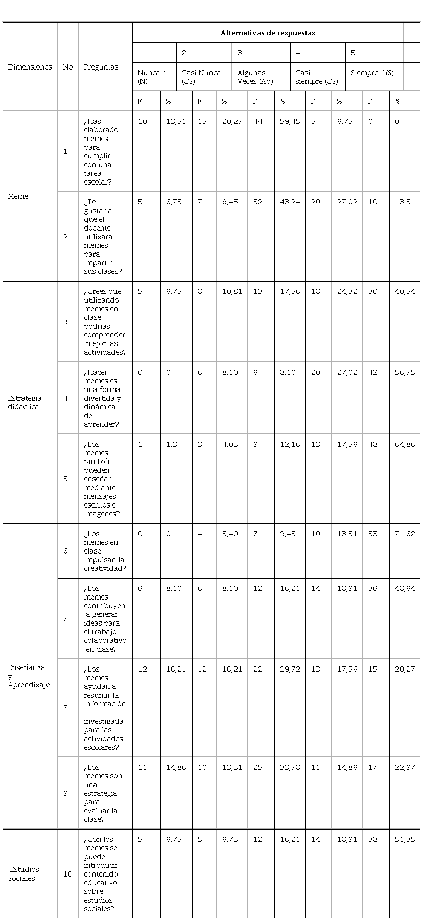 Finalmente, con la dimensión Estudios Sociales y la pregunta de que, si con los memes se puede introducir contenido educativo sobre estudios sociales, el 6,75% de los estudiantes declaró que no, igual numero 6,75% exteriorizó que casi nunca, mientras que el 16,21% aseguró que a veces, el 18,91% rebatió que casi siempre y el 51,35% alegó que siempre. Esto lleva a pensar que efectivamente los memes pueden utilizarse como estrategia de aprendizaje para unidades curriculares específicas.