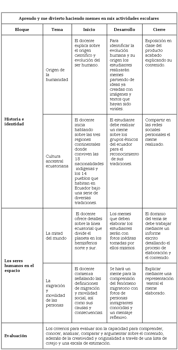 Tomando en cuenta los resultados obtenidos, la autora considera que, para implementar la utilización del meme en la enseñanza y aprendizaje de estudios sociales, se propone a continuación la estructura de una estrategia didáctica sustentada en las orientaciones del currículo de educación básica subnivel superior de la Republica de Ecuador, con basamento teórico en el aprendizaje significativo.