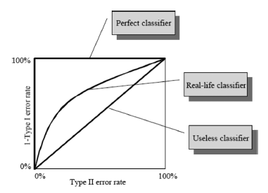 An ROC curve for the perfect classifier, which orders all bad cases before good cases, is the curve that follows the two axes. It would classify 100 per cent bad cases into class bad and 0 per cent good cases into class bad for some value of the sill. According to Yang (2002):