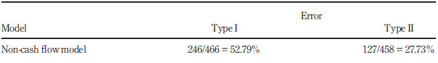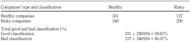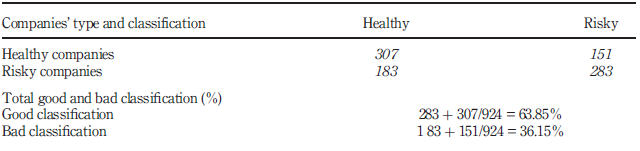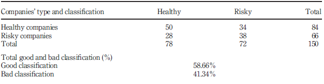 Findings – The results of the validation test show that the good classification rate is of the order of 58.66 per cent; nevertheless, the error types I and II remain relatively high at 42.42 and 40.47 per cent, respectively. A receiver operating characteristic curve is plotted to evaluate the performance of the model. The result shows that the area under the curve criterion is of the order of 69 per cent.