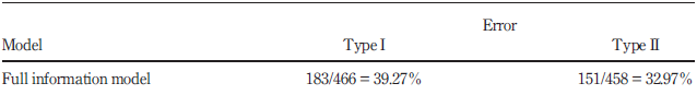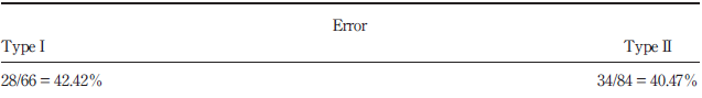Table IX presents the results of the validation test; we can see the corresponding good classification rate of the order of 58.66 per cent. The error types I and II remain relatively high at 42.42 and 40.47 per cent, respectively (Table X).