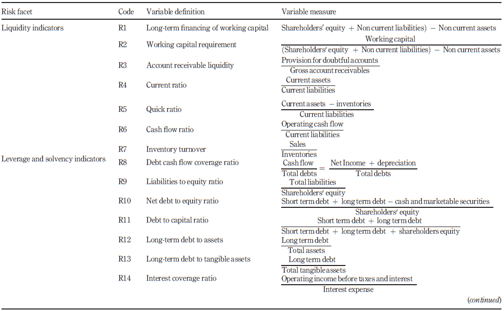In this research, we would like to assess credit risk using a selection of financial ratios recommended in debt contracts. The predictions on the selection of financial ratios illustrate the relation between financial ratios and credit risk. This evidence is well known in the practitioner and academic literature (Demerjian, 2007). In fact, textbooks emphasize the role of ratios in evaluating credit quality (Lundholm and Sloan, 2004), while academic studies conclude that financial ratios serve to provide signals about borrower credit risk when used as covenants (Smith and Warner, 1979; and Dichev and Skinner, 2002).