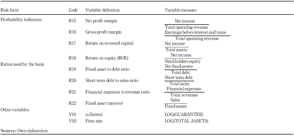 In our experiment, we retain 24 financial and nonfinancial indicators, 22 of them are financial ratios and 2 are not. The financial indicators are inspired from Altman’s popular Zscore and recommended textbooks in the field of financial statement analysis and valuation (Berstein and Wild, 1998; Revsine et al., 1999; and Palepu et al., 2000). The financial indicators measure liquidity (working capital, operating activity and cash flow), leverage, long-term solvency and profitability. The nonfinancial variables used in this research are firm size and collateral (Table I).