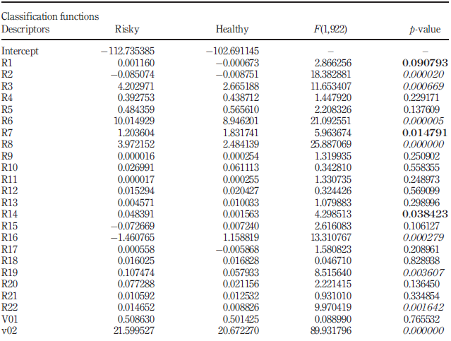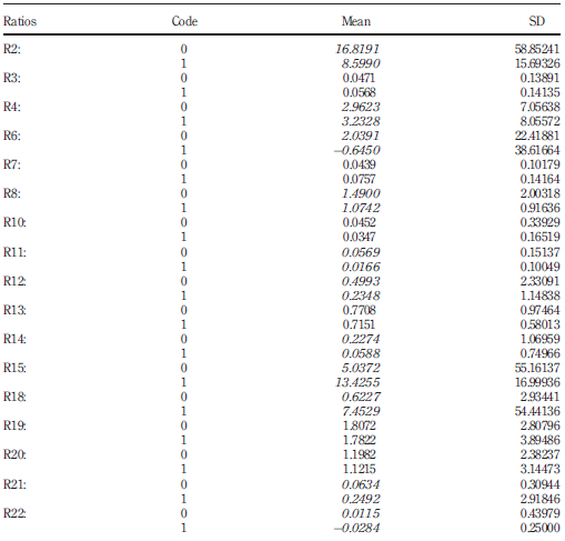 Table II shows significant mean differences between the two groups for some ratios (R2, R4, R6, R8, R11, R12, R14, R15, R18, R21 and R22) and no significant differences for others (R1, R3, R5, R7, R9, R10, R11, R13, R16, R17, R19 and R20). Globally, they tell us that the liquidity risk does not differentiate the two groups. The leverage and solvency ratios do better in differentiating the two groups. For other indicators (coverage and profitability), the results are mitigated. For example, while return on equity (R18) shows a significant difference, gross profit margin (R16) and return on invested capital (R17) do not.