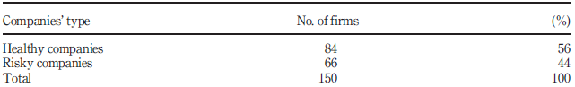 To get a better idea about our data before running the naive Bayes classifier models, we will perform a test of mean differences between the two risk classes defined above (Table II). The summary statistics and the mean differences can be seen as an analysis similar to that of Beaver (1963). Table II presents the descriptive statistics of our data. When we run the mean difference analysis between the two risk classes (healthy and risky groups), this analysis can give us a flavour of our data, as such an analysis allows us to verify if there is a difference between the two classes in terms of financial ratios. Table II recalculates some summary statistics for the two risk classes.