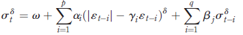 Another extension of the GARCH model that captures asymmetry by coefficient g is the PGARCH model of Ding et al. (1993), which is expressed by the following equation: