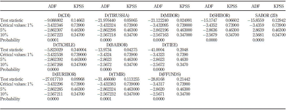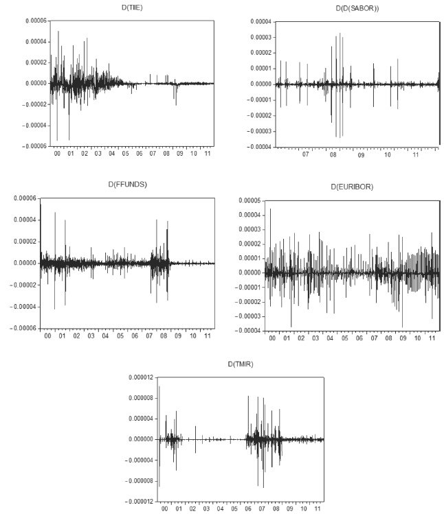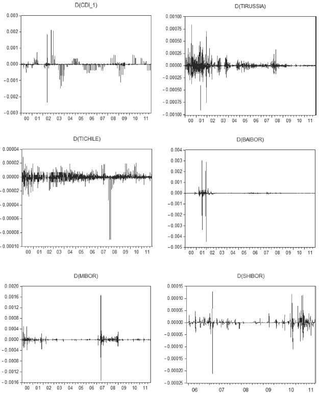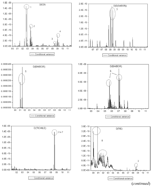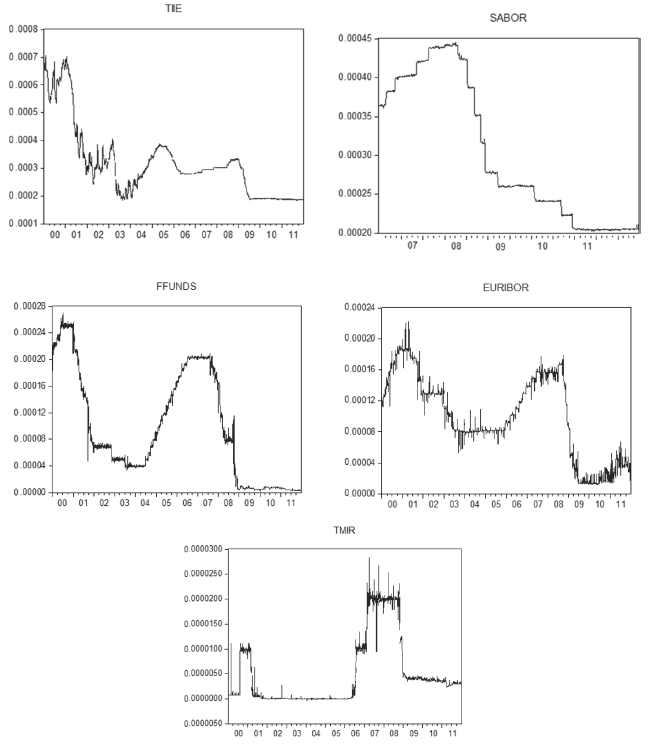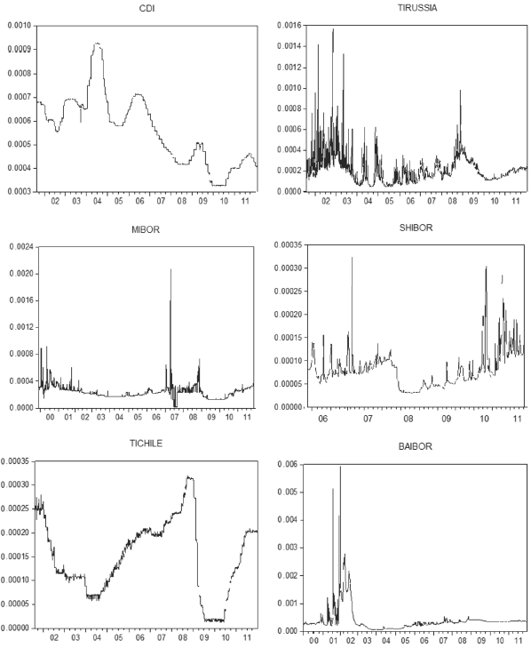 Figure 3 shows the volatility plots calculated using the conditional variances of each GARCH series shown above, for all the interbank rates examined. Although the CDI and SABOR series did not exhibit conditional heteroscedasticity in their ARIMA models and were thus not estimated in the GARCH models for selecting the most efficient model, these series were modelled on a GARCH (1, 1) process to facilitate the graphic representation of its volatility. The following series show that, even when the volatility has high peaks, the scale (y-axis) of the plots varies little; however, the peaks are considered.