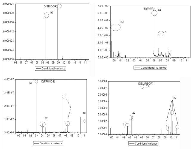 When analysing China’s interbank rate volatility (SHIBOR), only two peaks were found, one in 2008 and another in 2009 (Point 15) (the series consists of the 2006-2011 period only); these peaks are likely a result of the financial crisis in the first year because China is the largest creditor of US Government debt, followed by deflation in the following year.
