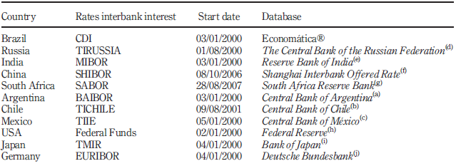 Table I shows the interbank rates for each country used in this study, the starting date of each series (the final date is 12/30/2011) and the database used. The interbank rates begin on the first working day of 2000, except for those of China and South Africa (due to database limitations).