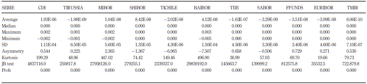 The time series of interbank rates that comprise the sample are all annual daily overnight rates (for 252 working days) and were transformed into daily rates per working day (used as the daily return), calculated as follows: