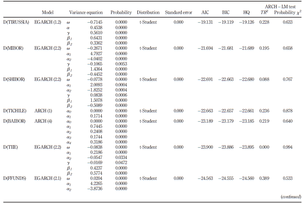 The daily MIBOR and TIIE series, which were best estimated by EGARCH (2.2) processes, unlike TIRUSSIA and SHIBOR, exhibited a negative
