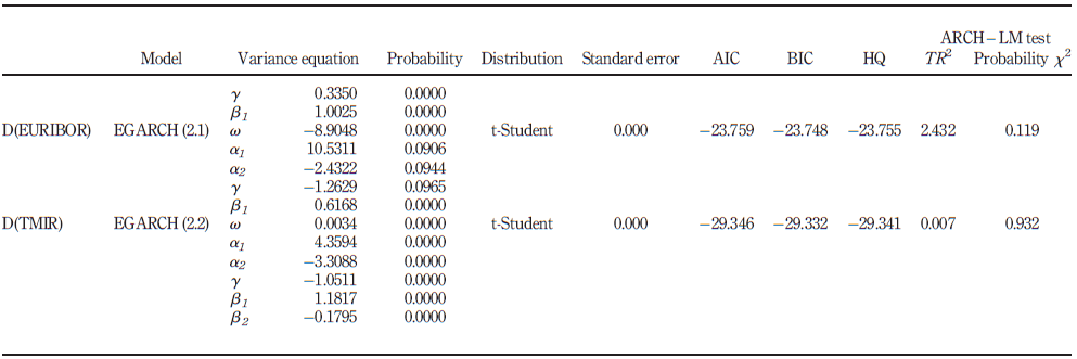 With respect to developed countries, all series were better modelled by EGARCH processes, namely, EGARCH (2, 1) for the FFUNDS and the EURIBOR, and EGARCH (2, 2) for TMIR. The EGARCH (1, 2) model for the FFUNDS series was the only model of the three series with a positive