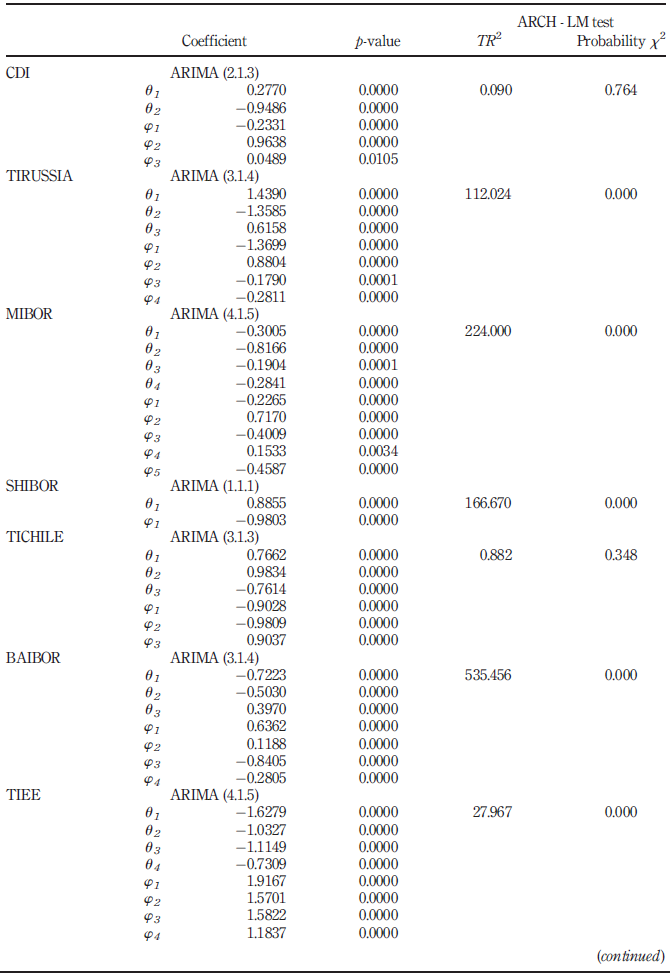 Design/methodology/approach – To the volatility of interest rates returns, the study used models of auto-regressive conditional heteroscedasticity, autoregressive conditional heteroscedasticity (ARCH), generalized autoregressive conditional heteroscedasticity (GARCH), exponential generalized autoregressive conditional heteroscedasticity (EGARCH), threshold generalized autoregressive conditional heteroscedasticity (TGARCH) and periodic generalized autoregressive conditional heteroscedasticity (PGARCH), and a combination of these with autoregressive integrated moving average (ARIMA) models, checking which of these processes were more efficient in capturing volatility of interest rates of each of the sample countries.