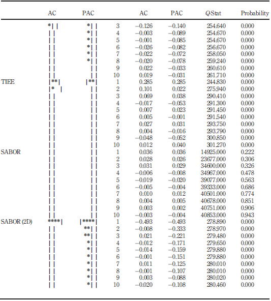 However, in the case of TICHILE series, the EGARCH (2, 2), EGARCH (2, 1) and EGARCH (1, 1) models (t distribution) presented lower information criteria values and standard errors than the ARCH (1) model, but the parameters were not significant, which is not in accordance with the criteria used to select the model.