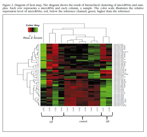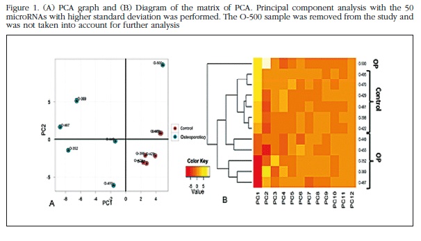 Cada muestra de hueso trabecular de cada una de las pacientes del estudio se analizó de forma individual en el microarray de miRNAs, y se realizó un análisis no supervisado de los resultados basado en el perfil de expresión con el fin de identificar los patrones de variación relacionados con factores biológicos o técnicos. Se realizó un análisis de componentes principales (PCA) incluyendo los 50 miRNAs con mayor variación de la expresión entre muestras para obtener una visión general de la agrupación de las muestras según su varianza (Figura 1). La agrupación de muestras no osteoporóticas (grupo control) mostró un perfil mucho más homogéneo que las muestras osteoporóticas. La muestra O-500, obtenida de una paciente con osteoporosis, se consideró un valor atípico y se excluyó de los análisis. El diagrama de mapa de calor corrobora los resultados del PCA con una clara agrupación de las muestras control y una agrupación más dispersa de las muestras osteoporóticas (Figura 2).