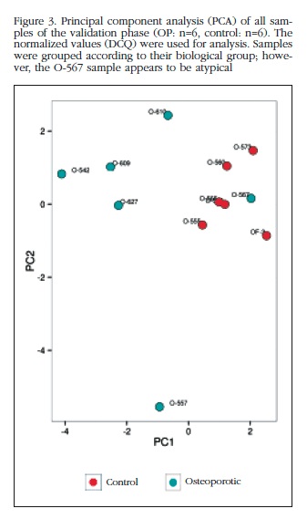 El análisis no supervisado de los resultados del array de expresión de miRNAs a partir de muestras óseas totales mostró que las muestras no osteoporóticas (control) se agrupaban generando un clúster biológico. Por otro lado, el hueso osteoporótico claramente difería de las muestras control, mostrando una distribución más dispersa, sugiriendo que la fisiopatología de la enfermedad osteoporótica y, en última instancia, la fractura del hueso, tienen una etiología heterogénea. El hecho de trabajar con muestras humanas frescas genera mayor variabilidad que trabajar con líneas celulares establecidas o modelos animales, haciendo difícil ver diferencias significativas entre grupos, pero ofrece un escenario más cercano a la situación fisiopatológica. En este sentido, nuestro estudio se ha basado en muestras de huesos humanos obtenidos con una mínima manipulación de laboratorio, lo que nos permite acercarnos a una situación lo más similar a las condiciones in vivo.
