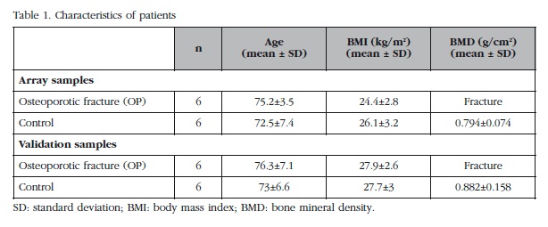 Las características antropométricas, tanto de las pacientes cuyas muestras óseas se utilizaron para el array de expresión, como de las pacientes para llevar a cabo las validaciones de los resultados del array, se muestran en la tabla 1. No había diferencias en la edad e índice de masa corporal entre los dos grupos de pacientes (prueba de Mann-Whitney).