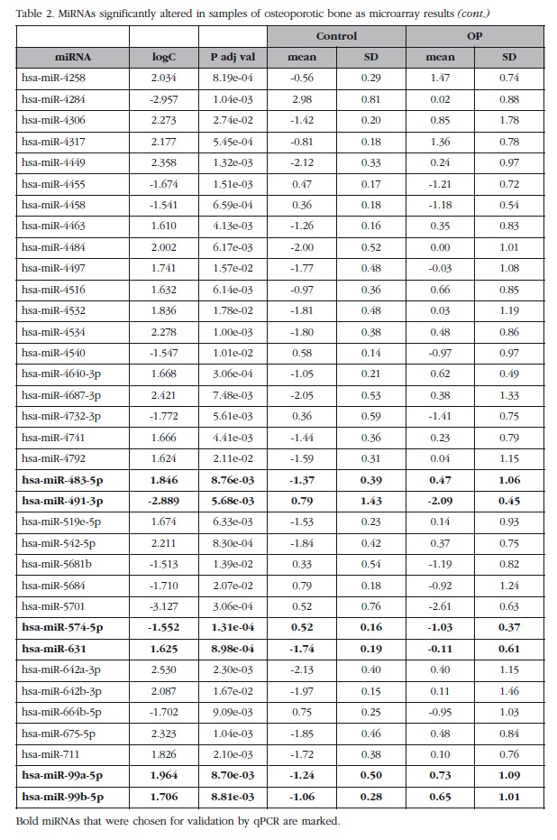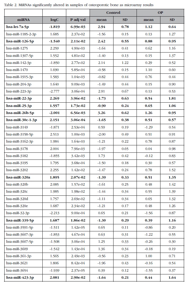 En el análisis de la expresión diferencial entre las muestras osteoporóticas y control, se encontraron 82 miRNAs que alcanzaron niveles de significación con un valor absoluto del logaritmo de la ratio mayor que 1,5 veces. De estos, 15 se testaron por qPCR en un nuevo conjunto de muestras, y los miRNAs miR-99a-5p, miR-339-5p, miR-320a y miR-22-3p fueron finalmente validados. Estos miRNAs se evaluaron en osteoblastos primarios (HOb) en cultivo, comparando células procedentes de muestras osteoporóticas versus células procedentes de muestras no osteoporóticas. Los miRNAs miR-99a-5p y miR-339-5p no se detectaron en los HOb, sugiriendo otro tipo celular como la fuente de estos dos miRNAs. Además, estos miRNAs se encontraron sobreexpresados en las muestras osteoporóticas del array mientras que estaban subexpresados en las muestras osteoporóticas de la fase de validación, descartando una relación de estos miRNAs con la osteoporosis. Los miRNAs, miR-320a y miR-22-3p sí se expresaban en los HOb, aunque no se observaron diferencias en sus niveles de expresión entre grupos de muestras. Esto podría ser debido a las condiciones artificiales de los cultivos celulares in vitro que afectarían la expresión de los microRNAs, sobre todo aquéllos implicados en la regulación de funciones celulares tan importantes como la proliferación y diferenciación.