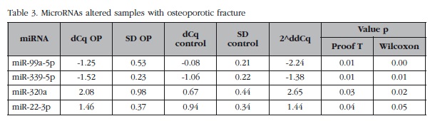 Objectives: To identify microRNAs (miRNAs) differentially expressed in bone samples with osteoporotic fracture compared with healthy bones. Methods: Total RNA was extracted from fresh trabecular bone of the femoral neck of women undergoing hip replacement surgery, either because to osteoporotic fracture (n=6) or in the absence of osteoarthritis osteoporosis (based on BMD) (n=6). The samples were hybridized on an array of miRNAs and PCA diagrams and heat map were made. To compare expression levels, >1.5 times and a value p<0.05 Student's T test (corrected for multiple testing) was set as a threshold of significant change. Results: Both PCA analysis and the heat map showed a samples grouping whether there was fracture or not. 790 were detected miRNAs in bone samples, 82 of which were altered in the osteoporotic samples. After validation in another panel of 6 samples 6 osteoporotic and non-osteoporotic by PCR real time of the most significant miRNAs, and for which there was a test available, the miRNAs, miR-320a and miR-22-3p were confirmed. These two miRNAs were detected in cultures of primary osteoblasts, although they did not maintain the same pattern of expression in total bone samples. Conclusions: We have shown that there are differences in the expression of miRNAs in samples with osteoporotic fracture. This opens prospects for research and design of new therapies.