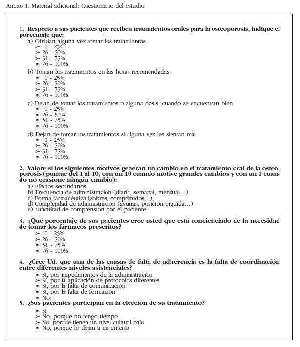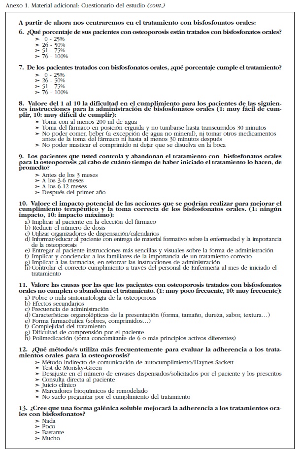 Estudio descriptivo transversal realizado mediante una encuesta dirigida a médicos de Atención Primaria (AP) y Atención Especializada involucrados en el tratamiento de la osteoporosis. La encuesta constaba de 13 preguntas sobre la percepción de los profesionales sanitarios en relación a la adherencia terapéutica del paciente osteoporótico (Anexo 1), y fue cumplimentada a través de una página web. Los participantes fueron seleccionados mediante muestreo intencionado e invitados por la Sociedad Española de Investigación Ósea y Metabolismo Mineral (SEIOMM) a la cual estaban asociados. Para la estimación del número de especialistas que debían participar en la encuesta, se tomó como referencia una población a nivel nacional de unos 20.000 médicos de AP y 5.000 médicos especialistas. Según el cálculo del tamaño muestral, realizado tomando el escenario de proporción de participación más desfavorable, para una precisión esperada del 10% y para un nivel de confianza del 95%, se precisó que debían participar un mínimo de 200 facultativos.