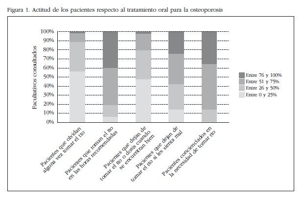 Respecto al tratamiento con bisfosfonatos, un 51-75% de los pacientes están tratados y cumplen con dicho tratamiento en opinión del 63% y del 60,9% de los consultados, respectivamente. Por otro lado, entre los pacientes que abandonan el tratamiento, el 40% lo hace antes de los seis meses, el 29,4% entre los seis y doce meses, y el 30,6% lo hace después del primer año.