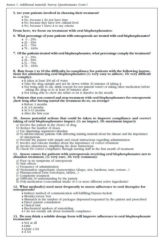 En conclusión, esta encuesta pone de manifiesto que los especialistas que manejan la osteoporosis perciben una baja adherencia del paciente al tratamiento oral de la enfermedad. La baja adherencia se materializa principalmente por el abandono de la medicación durante el primer año de terapia, y se asocia fundamentalmente a los efectos secundarios, a la polimedicación y a la falta de comunicación entre profesionales. Mejorar la comodidad disminuyendo el número de tomas y empleando formas galénicas solubles, mejorar la educación sobre la importancia de la enfermedad, y aumentar el seguimiento del paciente, serían algunos de los aspectos que podrían favorecer la adherencia terapéutica