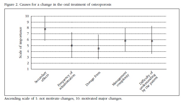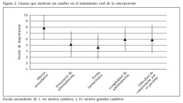 Otros de los motivos que ocasionan esta falta de adherencia terapéutica del paciente según los consultados, y en línea con otras publicaciones, son los efectos secundarios y la polimedicación; que, además, son percibidos como los motivos más frecuentes que motivan un cambio de tratamiento con bisfosfonatos [26,28,29,30,31,32].