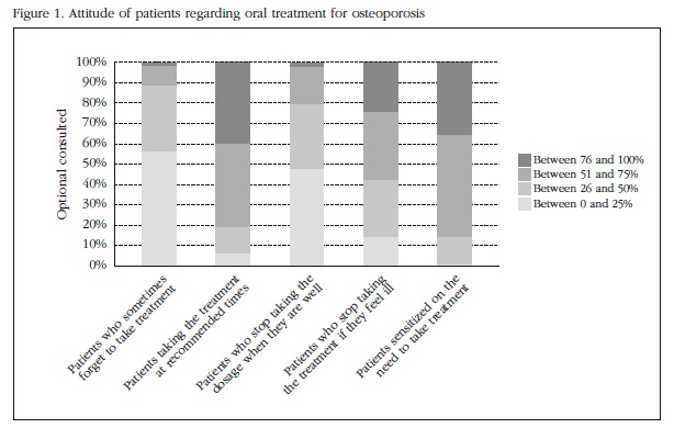 Introduction: Adherence to oral treatment of patients with osteoporosis is low, with a high dropout rate in the first year. The most noteworthy result is the lack of therapeutic response. Objective: To ascertain the perception of physicians working with osteoporotic patients regarding adherence of these patients. Methods: Cross-sectional study conducted by opinion survey aimed at primary care physicians and specialists involved in osteoporosis treatment. Participants were selected by purposive sampling. Results: The questionnaire was answered by 235 specialists encompassing rheumatology (54.5%), orthopedics (10.6%) and primary care (18.7%). In 43.8% of participants, more than 25% of patients sometimes forget to take their treatment. According to 34.9%, more than 75% of patients are aware of treatment. Side effects and management complexity are the majority reasons that lead to a change in medication, mean value of 7.94±2.06 6±2.01 points respectively on a 0-10 scale. Conclusions: Overall, medical specialists attributed low adherence to side effects, polypharmacy and lack of communication between professionals. Dosage and space use of soluble dosage forms may be options to facilitate patient adherence to treatment with oral bisphosphonates. Improved education concerning the importance of the disease or increased patient monitoring could foster adherence.