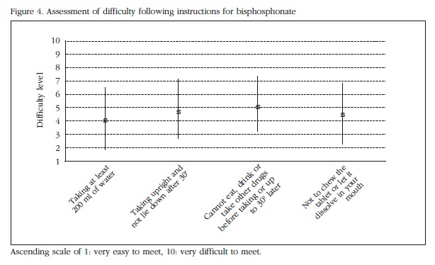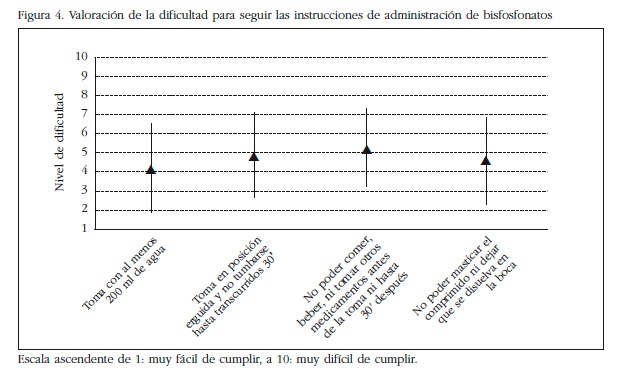 En coincidencia con los resultados de este estudio, la disminución de la frecuencia de la toma de medicación, la educación al paciente y el seguimiento del cumplimiento terapéutico se han propuesto entre las actuaciones consideradas que podrían mejorar la toma de bisfosfonatos [29,30,35,36,37,38,39].