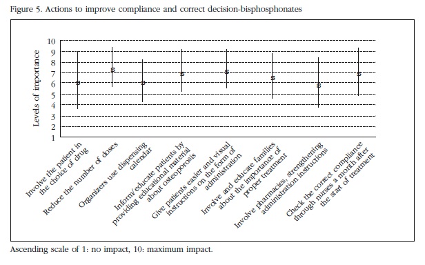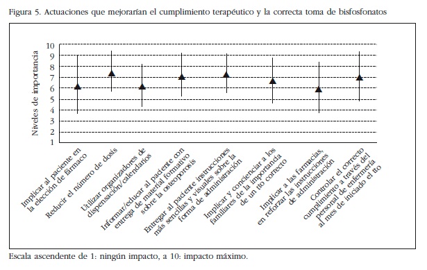 En cuanto al impacto que tienen distintas actuaciones para facilitar el cumplimento del tratamiento a bisfosfonatos, las más valoradas (escala ascendente de 1: ningún impacto, a 10: impacto máximo) fueron: la reducción del número de dosis (7,57±1,88 puntos), la entrega al paciente de material formativo sobre la enfermedad y los tratamientos (7,25±1,89 puntos) y el control del cumplimiento terapéutico a las pocas semanas de su inicio por parte de enfermería (7,12±2,21 puntos) (Figura 5). Finalmente, el 88,9% de los facultativos consultados consideró que la adherencia terapéutica a los tratamientos orales con bisfosfonatos mejoraría bastante o mucho con una forma galénica soluble.