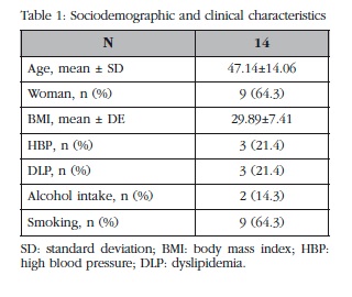 La edad media de los 14 pacientes fue de 47±14 años. El 64,3% fueron mujeres. El 21,4% de los pacientes incluidos eran hipertensos y el 64,3% eran fumadores. Los valores del resto de variables se muestran en la tabla 1.