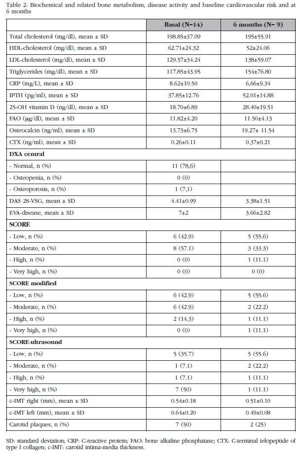 El 71,5% presentaron factor reumatoide positivo y anticuerpos antipéptido citrulinado. El 64,3% de los pacientes incluidos en el estudio tomaban fármacos modificadores de la enfermedad (FAMEs) asociados a la terapia biológica. La dosis media de prednisona fue de 3,7±2,5 mg.